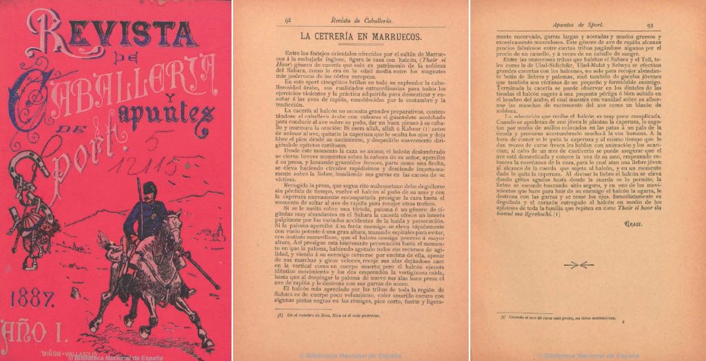 La Biblioteca Nacional de España es un organismo que tiene como principal función ser depositario del patrimonio bibliográfico y documental de este país. En este sentido, desarrolla una profunda labor de recopilación, catalogación y conservación en beneficio de toda la sociedad al reunir una inmensa cantidad de conocimiento de incalculable valor, y lo más importante, al alcance de todos. Además, hoy resulta más fácil que nunca acceder a buena parte de sus fondos bibliográficos o documentales, pues muchos de los mismos se encuentran digitalizados y accesibles desde su página Web. Títulos de gran valor para el conocimiento del arte de cetrería pueden consultarse así de forma remota desde cualquier ordenador con acceso a internet. Tal es el caso de los clásicos tratados medievales y algunos posteriores de autores tan reconocidos por todos como: el Príncipe don Juan Manuel, Pero López de Ayala, Luis Zapata, Fadrique de Zúñiga y Sotomayor, Juan Vallés, Muhammad b. Abd Allah Al-Bayzar, entre un largo etcétera. No obstante, además de disponer de la obra de estos grandes cetreros y literatos de carácter polifacético, es posible encontrar referencias a nuestro arte que pasan desapercibidas pese al valor que pudieran ofrecer al conocimiento y conservación de la cetrería. A veces por ser meras citas o alusiones en libros o manuscritos de otras materias y otras por encontrarse en formatos a los que no se presta tanta atención, como es el caso de las revistas o fotografías. Sirva de ejemplo la “Revista de caballería y apuntes de sport”, una publicación de 1887 en la que constaba un artículo dedicado a la cetrería.