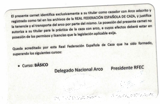 Debemos dejar claro que se trata de un documento de ámbito interno de la Federación de Caza. Hoy por hoy no es obligatorio para practicar la caza, pero sí es necesario para poder competir en recorridos de caza con arco, además de servirnos como una acreditación más para justificar su tenencia y transporte, sin perjuicio de tener que contar con la correspondiente tarjeta federativa, tal y como vimos en el apartado anterior sobre «normativa para tener un arco». A mayor abundamiento, para poder disponer del carnet básico o del T2, es requisito indispensable disponer de la tarjeta federativa de la federación de caza.